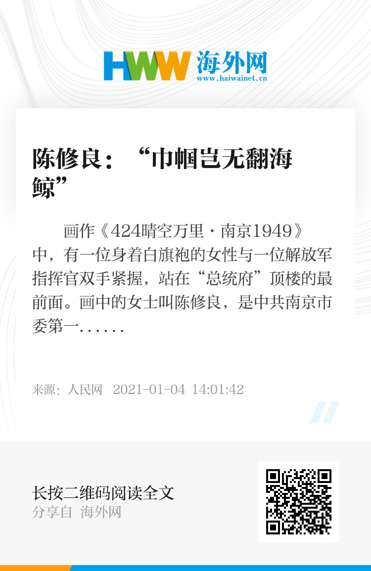 画作《424晴空万里·南京1949》中,有一位身着白旗袍的女性与一位解放军指挥官双手紧握,站在“总统府”顶楼的最前面。画中的女士叫陈修良,是中共南京市委第一位女书记,在南京解放中发挥了重要作用。