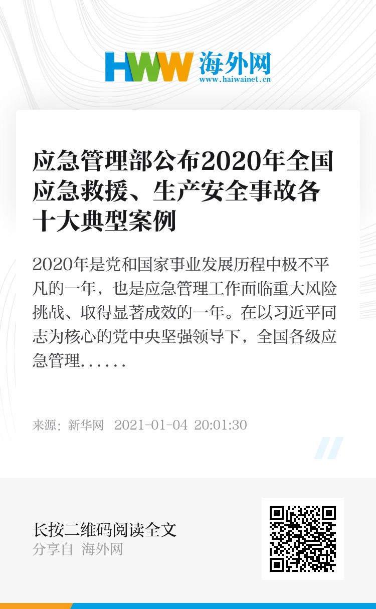 日前,应急管理部会同国务院安委会办公室、国家减灾委办公室对2020年各类突发灾害事故案例进行梳理,公布了应急救援、生产安全事故各十大典型案例,认真总结应急救援和现场处置的成功经验,推动各地区、各部门、各企业深刻吸取有关事故教训,统筹发展和安全,树牢安全发展理念,压紧压实安全责任,提升全社会应急意识、安全意识和责任意识,筑牢防灾减灾救灾的人民防线。