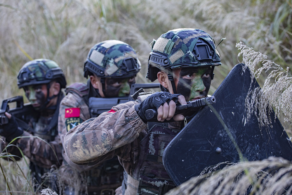 2021年1月4日,广西贺州,反恐演练课目中,武警广西总队贺州支队特战队员在草丛中搜索“暴恐分子”。图片来源:人民视觉/视觉中国