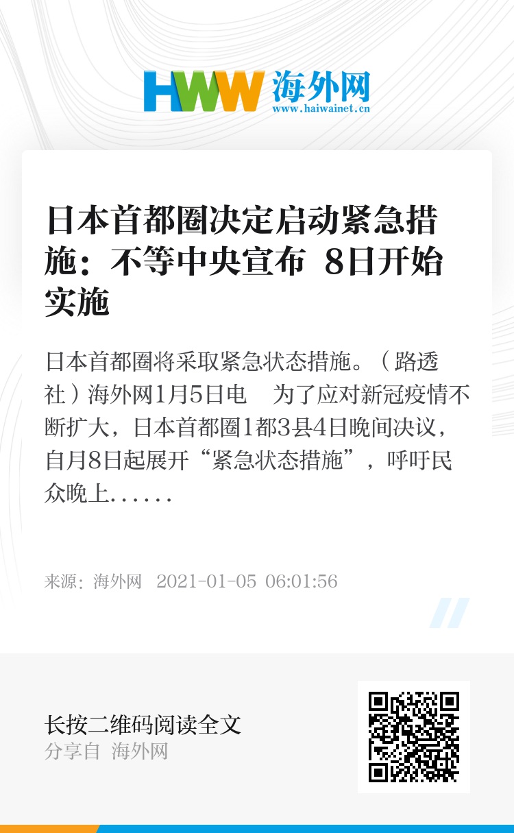 海外网1月5日电 为了应对新冠疫情不断扩大,日本首都圈1都3县4日晚间决议,自月8日起展开“紧急状态措施”,呼吁民众晚上8时以后避免外出,并要求餐饮业者提早打烊。
