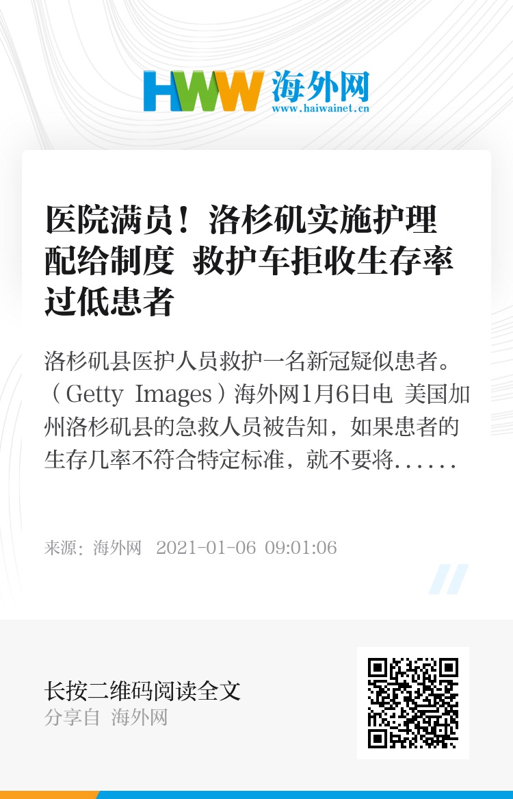 海外网1月6日电 美国加州洛杉矶县的急救人员被告知,如果患者的生存几率不符合特定标准,就不要将患者送往医院。当前,该地医护人员正试图专注于医治大量的新冠肺炎患者,这迫使他们进行护理配给制度。