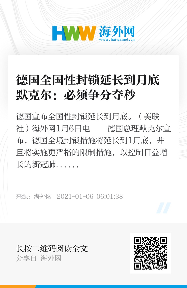 海外网1月6日电 德国总理默克尔宣布,德国全境封锁措施将延长到1月底,并且将实施更严格的限制措施,以控制日益增长的新冠肺炎感染人数。