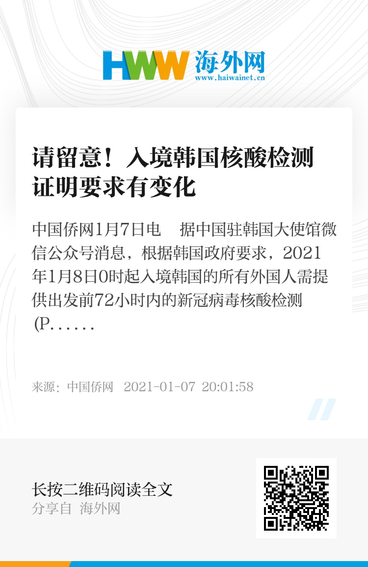 中国侨网1月7日电 据中国驻韩国大使馆微信公众号消息,根据韩国政府要求,2021年1月8日0时起入境韩国的所有外国人需提供出发前72小时内的新冠病毒核酸检测(PCR)阴性证明。中国驻韩国大使馆已发布相关提醒。