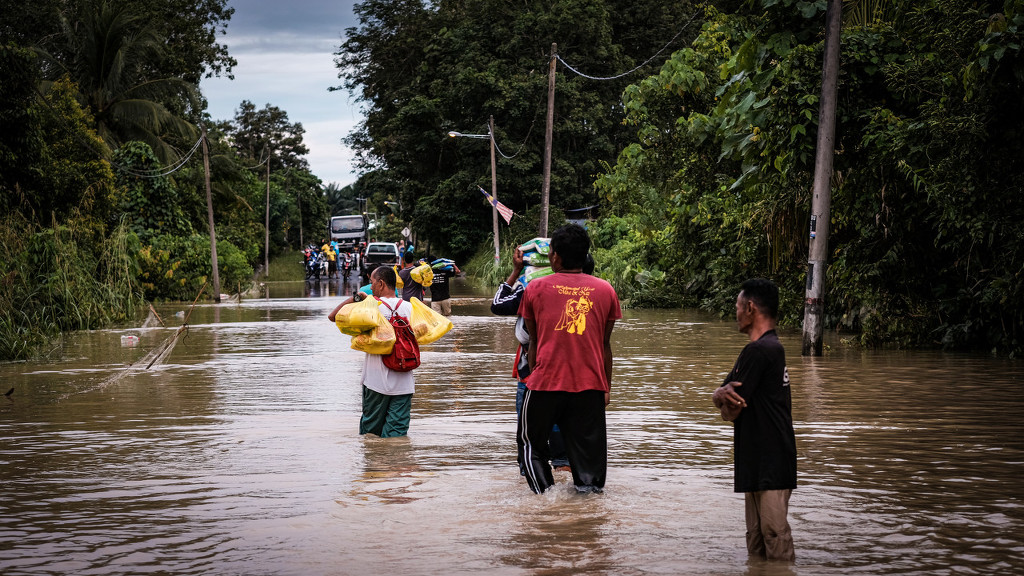 当地时间2021年1月6日,马来西亚彭亨州,当地日强降雨引发水灾,志愿者运送食物补给。图源:东方IC