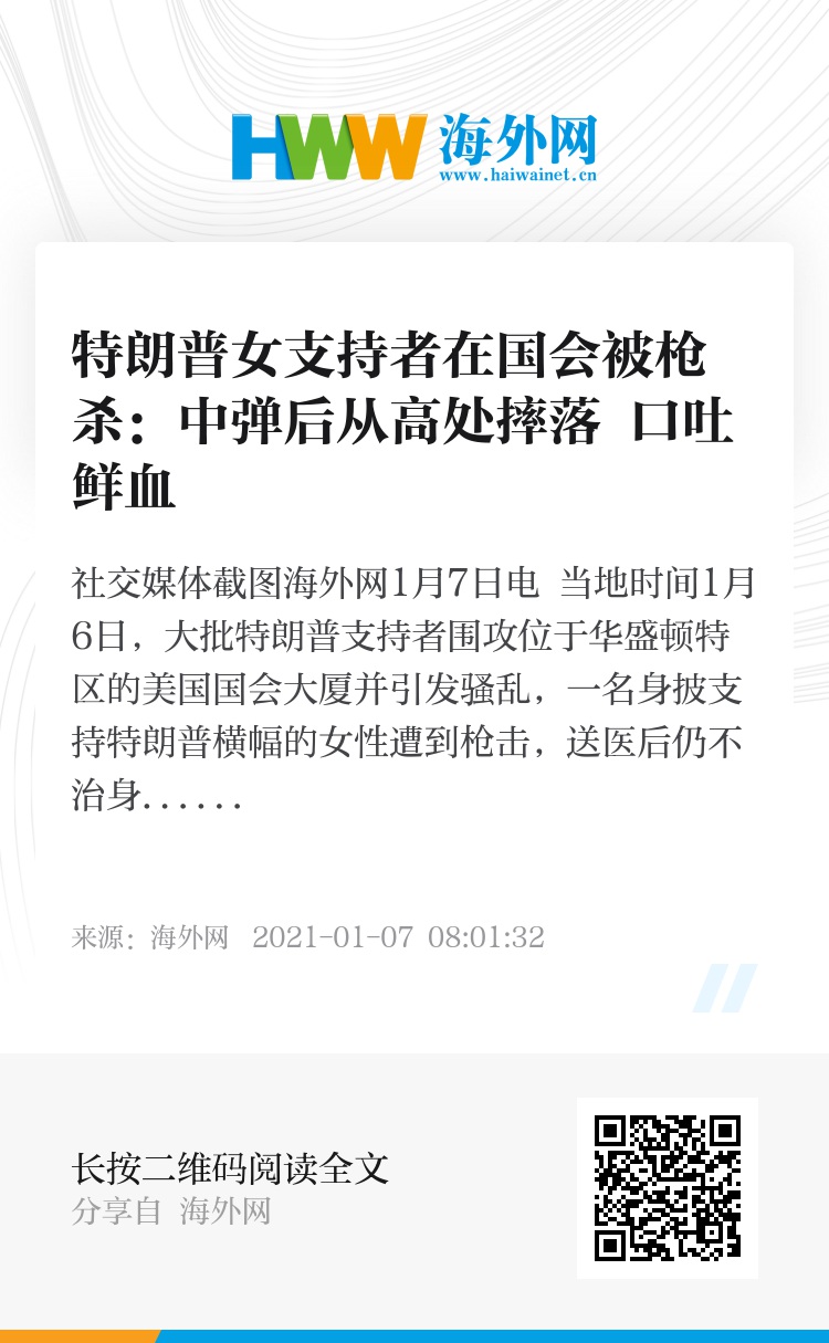 海外网1月7日电 当地时间1月6日,大批特朗普支持者围攻位于华盛顿特区的美国国会大厦并引发骚乱,一名身披支持特朗普横幅的女性遭到枪击,送医后仍不治身亡。