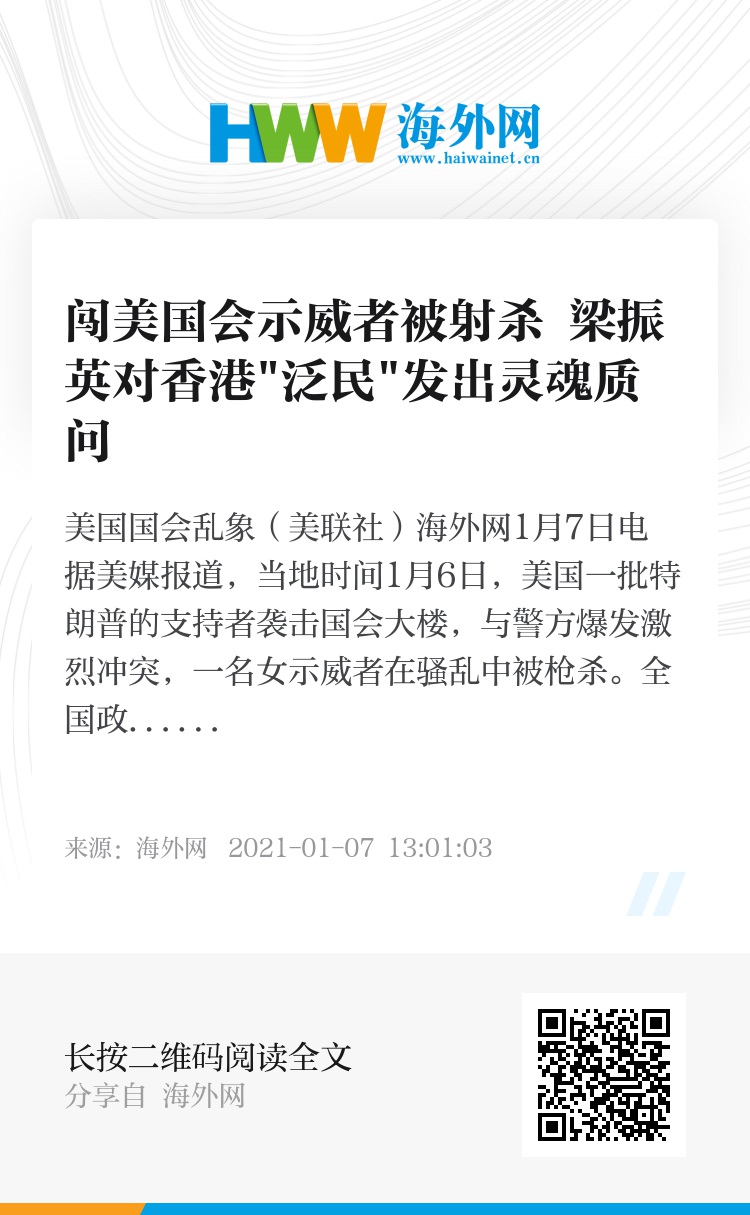 据悉,梁振英提到的美国国会示威者中枪身亡一事发生在当地时间6日,一名身披支持特朗普横幅的女性在国会内遭到枪击,摔倒在地,口中涌出鲜血,被送医后仍不治身亡。