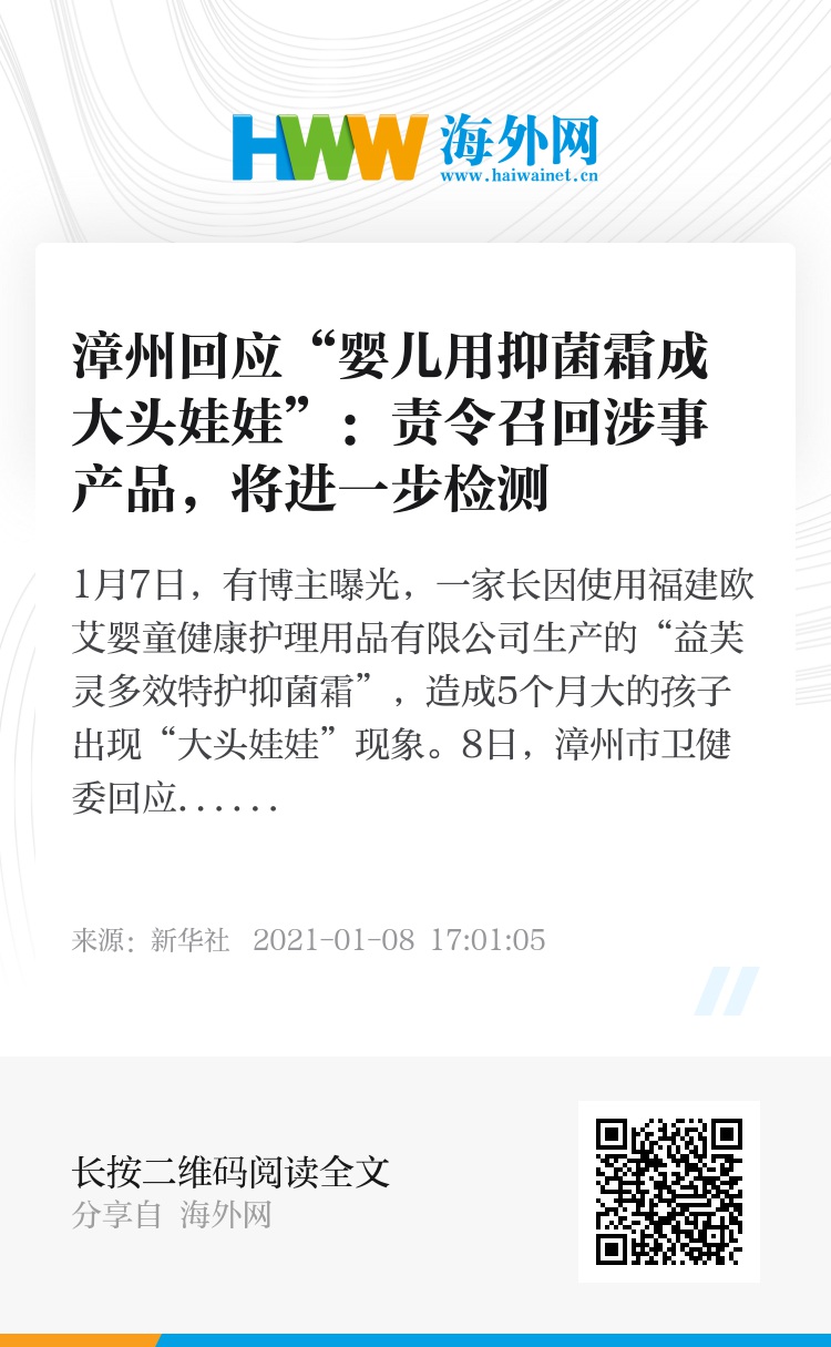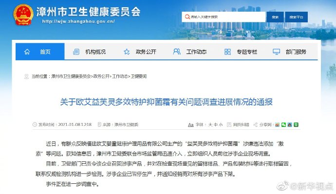 1月7日,有博主曝光,一家长因使用福建欧艾婴童健康护理用品有限公司生产的“益芙灵多效特护抑菌霜”,造成5个月大的孩子出现“大头娃娃”现象。8日,漳州市卫健委回应称,已责令该企业召回涉事产品,并对在检查现场查见的留样样品、产品包装材料等进行取样留置,联系权威检测机构进一步检测。涉事企业已暂停生产,并通知经销商对所有涉事产品下架。(记者吴剑锋、魏培全)