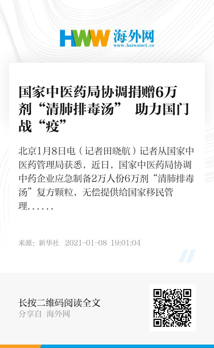 新华社北京1月8日电(记者田晓航)记者从国家中医药管理局获悉,近日,国家中医药局协调中药企业应急制备2万人份6万剂“清肺排毒汤”复方颗粒,无偿提供给国家移民管理机构所属一线执勤民警抗击新冠肺炎疫情专用。
