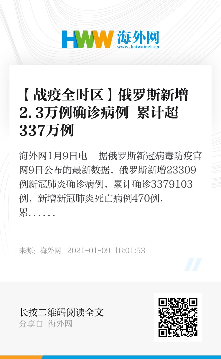 31957378,.【战疫全时区】俄罗斯新增2.3万例确诊病例 累计超337万例,.2021-01-09 16:09:53,.204477,.吴倩、刘强
