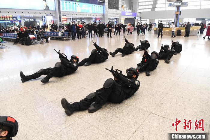 1月10日,特警们为旅客展示了刺杀操、战术枪操、战术手语等表演,吸引众多旅客参观。当日,为庆祝首个中国人民警察节,重庆铁路警方在火车北站候车大厅内,开展了系列主题庆祝活动,让旅客切实感受到人民警察在身边的安全感和幸福感。特警们为旅客表演各类战术。 陈超 摄