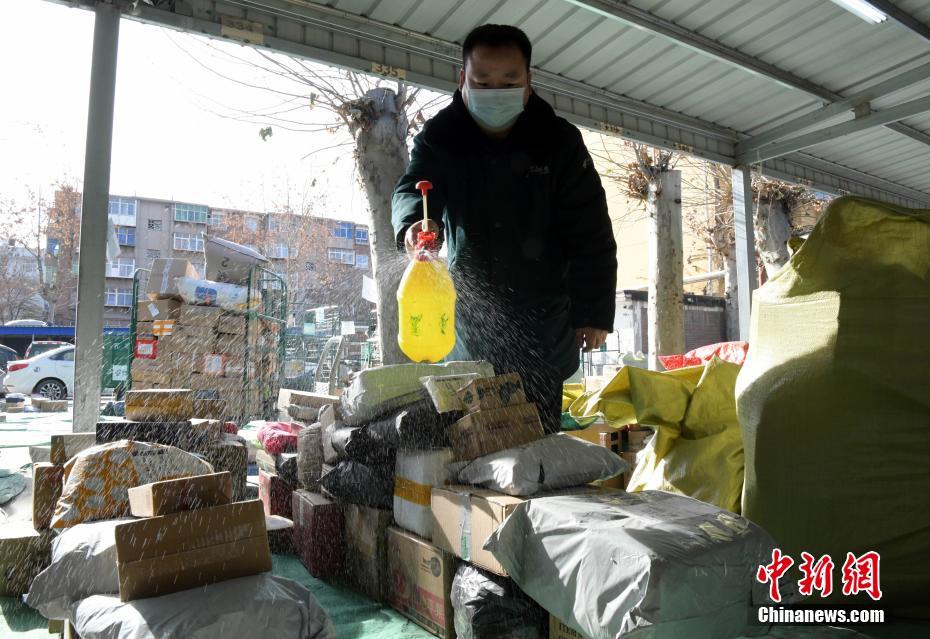 1月10日上午,石家庄市快递服务恢复运营,在中国邮政集团有限公司石家庄市分公司翟营投递部,工作人员正在对即将投递的快递进行消毒。据了解,首日参与快递派送工作的快递员已经过二次核酸检测,投递将尽可能采取无接触形式进行。 中新社记者 陈昊 摄