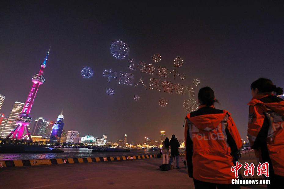 1月10日晚,1100架无人机从上海北外滩虹口滨江起飞,在空中组成多种图案,向在首个中国人民警察节节日中坚守岗位的人民警察致以崇高敬意。中新社记者 殷立勤 摄