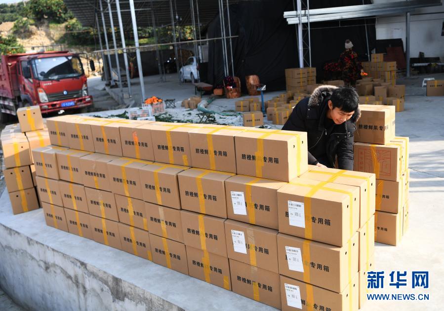 1月11日,奉节县安坪镇三沱村一脐橙收购点的工作人员在清点即将发货的脐橙。新华社记者 王全超 摄