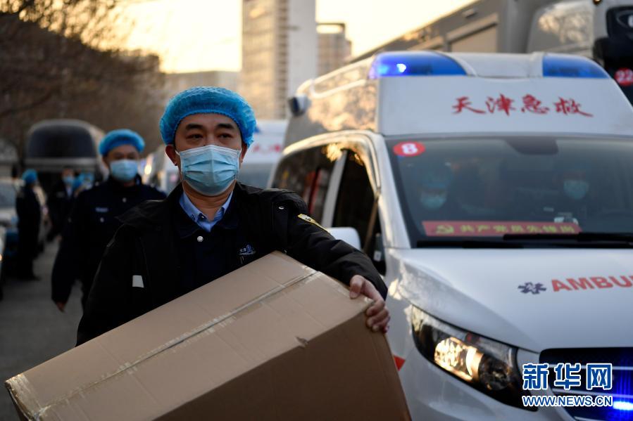 1月11日,在天津市急救中心,医疗队员往车上搬运物资。新华社记者 李然 摄