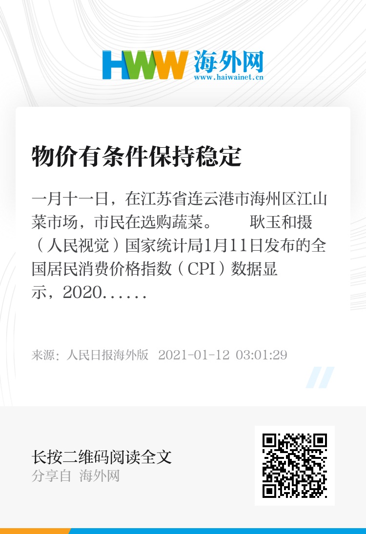 国家统计局1月11日发布的全国居民消费价格指数(CPI)数据显示,2020年12月份,CPI同比上涨0.2%。其中,食品价格上涨1.2%,非食品价格持平。2020年全年,全国居民消费价格比上年上涨2.5%。相关人士指出,2020年,CPI涨幅整体呈现前高后低的格局,全年涨幅处于合理运行区间,完成了物价调控目标。接下来,物价可能受季节性因素、新冠肺炎疫情等影响有所波动,但总体上有条件保持稳定。