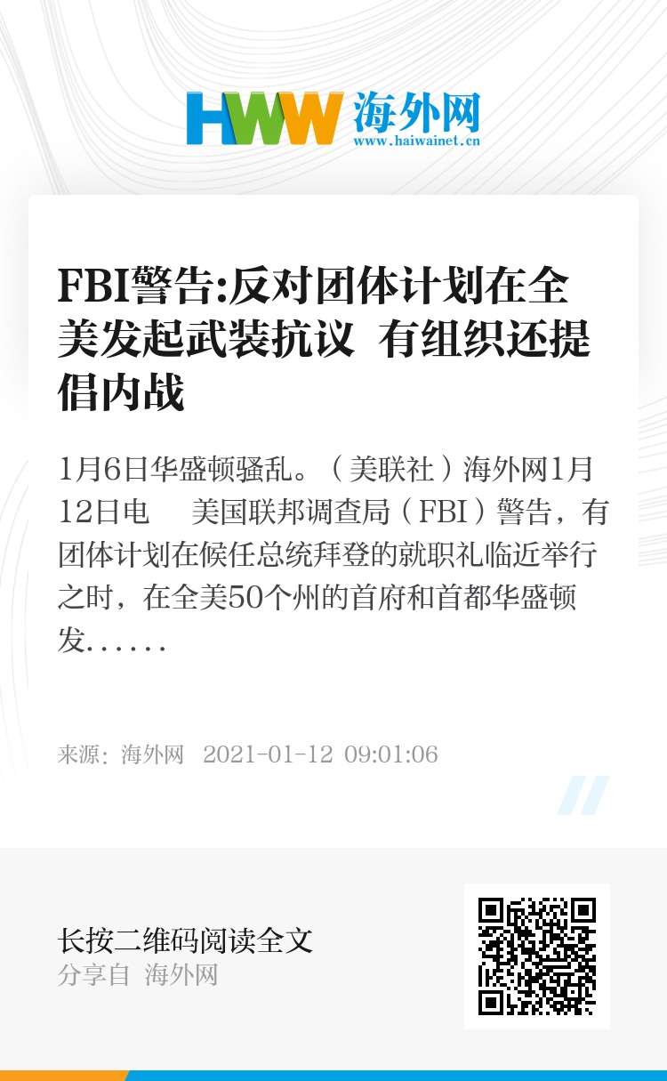 海外网1月12日电 美国联邦调查局(FBI)警告,有团体计划在候任总统拜登的就职礼临近举行之时,在全美50个州的首府和首都华盛顿发动全国武装抗议活动,届时恐再引致流血事件。为防范总统特朗普的支持者再出现暴力行为,国防部将向华盛顿哥伦比亚特区增派国民警卫队。