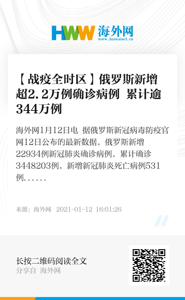 31959161,.【战疫全时区】俄罗斯新增超2.2万例确诊病例 累计逾344万例,.2021-01-12 16:07:26,.204249,.李萌、王西洛