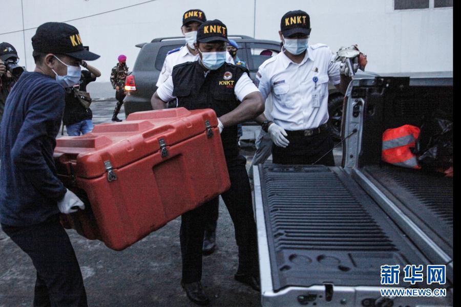 1月12日,在印度尼西亚首都雅加达,工作人员将装有“飞行数据记录仪”的箱子搬上卡车。新华社发(阿迪蒂亚·伊拉万摄)