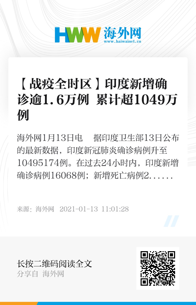 31959674,.【战疫全时区】印度新增确诊逾1.6万例 累计超1049万例,.2021-01-13 11:54:28,.204477,.吴倩、安再尔江•艾合买提