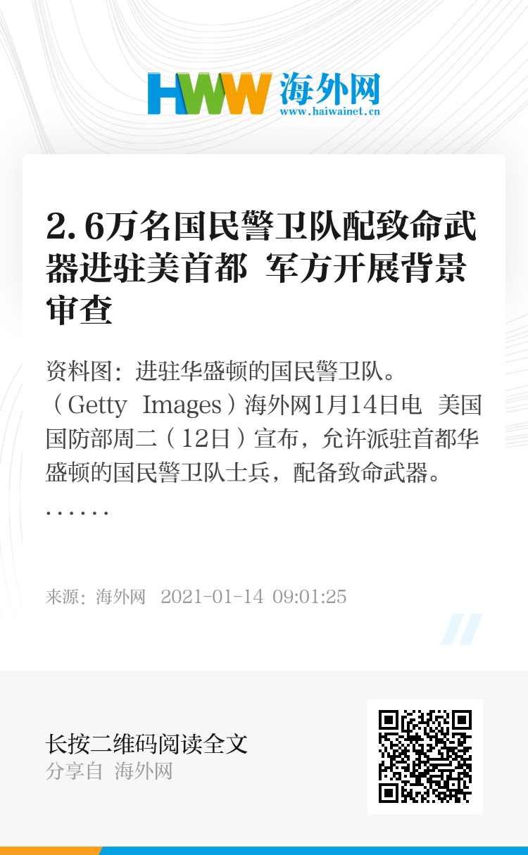 海外网1月14日电 美国国防部周二(12日)宣布,允许派驻首都华盛顿的国民警卫队士兵,配备致命武器。周三(13日)有报道指出,再多5000名国民警卫队获授权派驻华盛顿哥伦比亚特区,令拜登就职礼前进驻美国首都的国民警卫队达2.6万人。