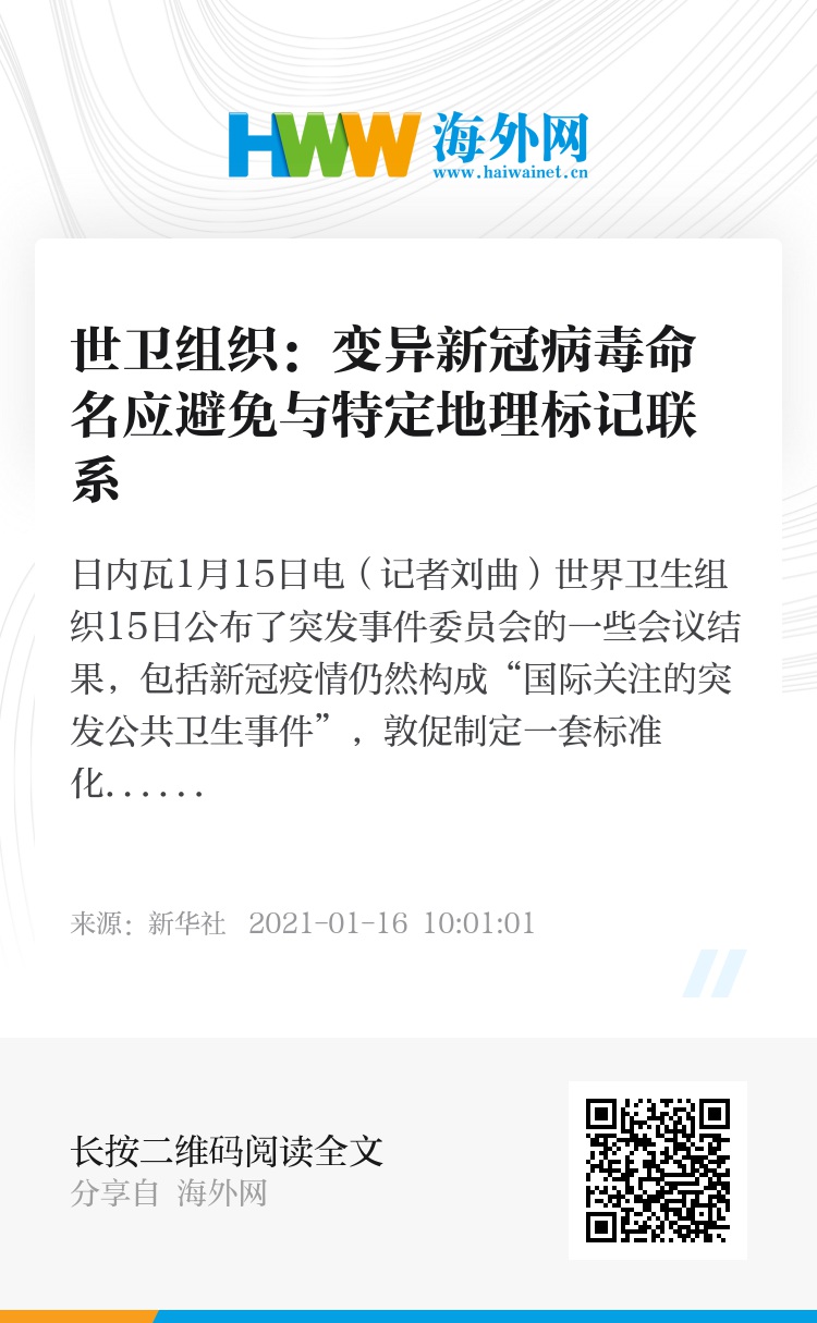 新华社日内瓦1月15日电(记者刘曲)世界卫生组织15日公布了突发事件委员会的一些会议结果,包括新冠疫情仍然构成“国际关注的突发公共卫生事件”,敦促制定一套标准化的系统来命名变异新冠病毒并应避免将病毒和特定地理标记联系等。