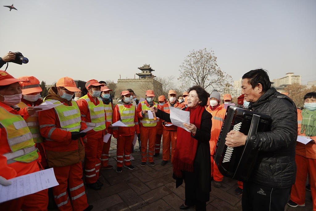 2021年1月15日下午,在西安东南城角的小广场,著名女高音歌唱家贠恩凤情绪饱满一遍遍教30多位环卫工人唱《飘香的黄玫瑰》。《飘香的黄玫瑰》这首歌曲,是三位老艺术家疫情期间专为环卫工人创作的。图片来源:视觉中国