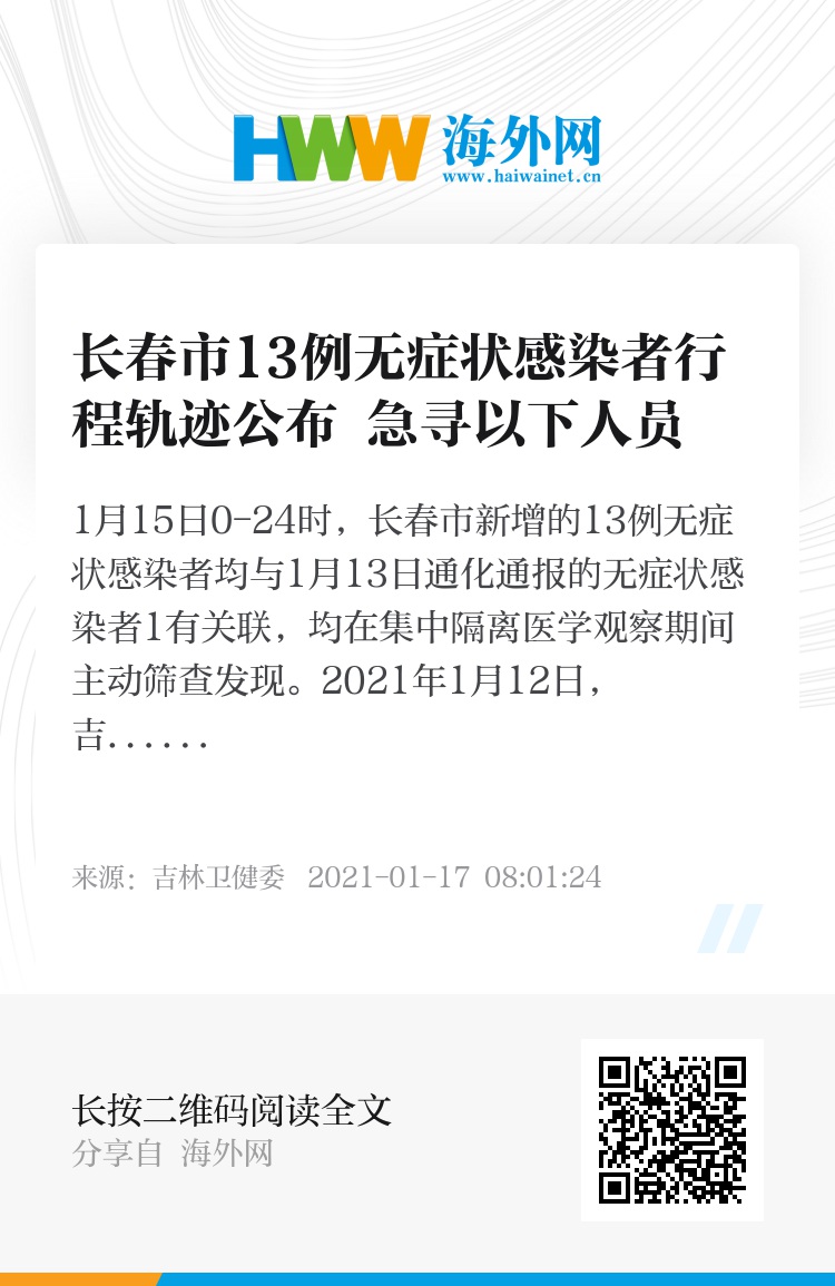 1月15日0-24时,长春市新增的13例无症状感染者均与1月13日通化通报的无症状感染者1有关联,均在集中隔离医学观察期间主动筛查发现。