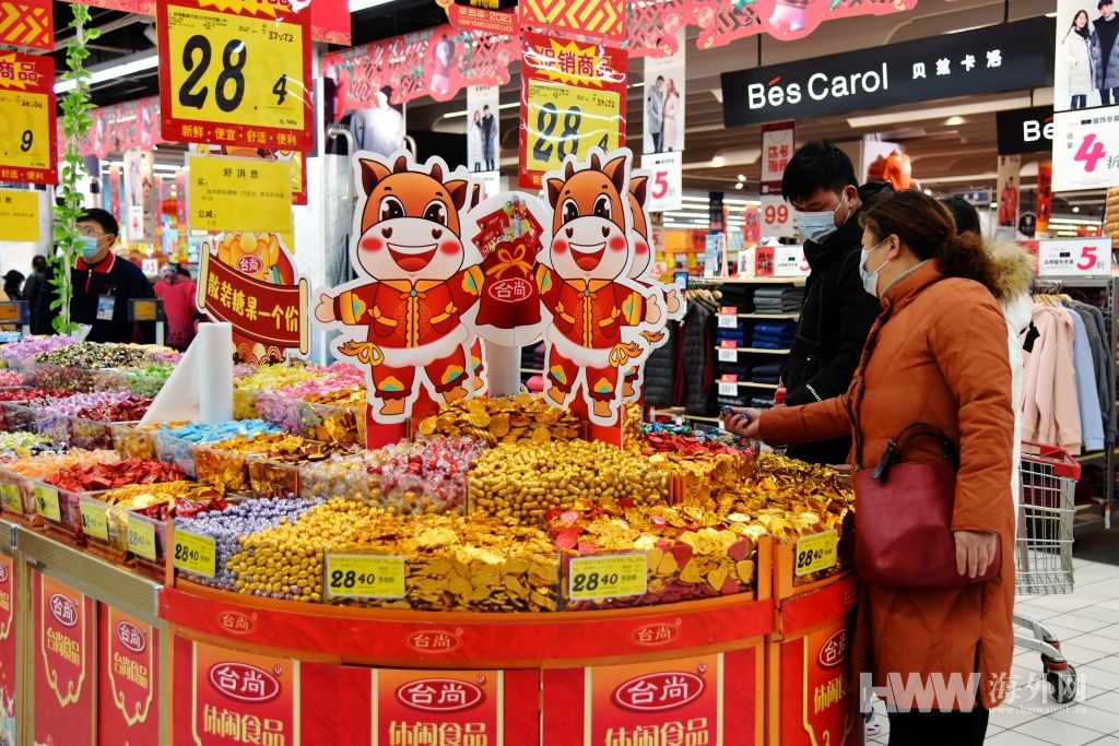 2021年1月16日,春节临近,江苏省如皋市众多消费者开始置办年货,各大超市、商场纷纷推出“年货大街”。商家们在打响新年促销战同时,疫情防控丝毫不松,对进入“年货大街”购物的消费者提醒佩戴口罩、测量体温。同时,防疫工作人员定时对购物设施、公共区域进行喷药消毒,确保群众安全购物,市场呈现购销两旺的红火态势。(供图:东方IC)