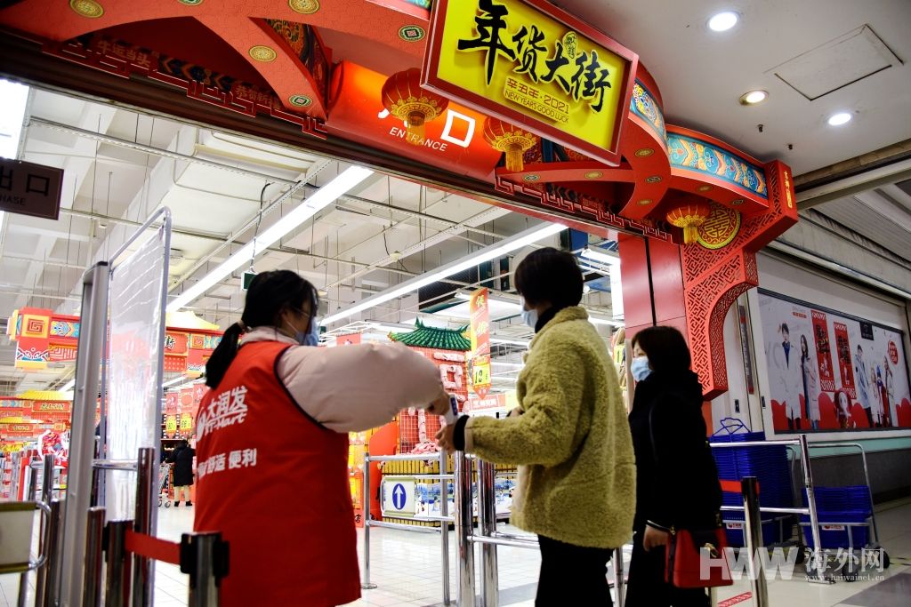 2021年1月16日,春节临近,江苏省如皋市众多消费者开始置办年货,各大超市、商场纷纷推出“年货大街”。商家们在打响新年促销战同时,疫情防控丝毫不松,对进入“年货大街”购物的消费者提醒佩戴口罩、测量体温。同时,防疫工作人员定时对购物设施、公共区域进行喷药消毒,确保群众安全购物,市场呈现购销两旺的红火态势。(供图:东方IC)