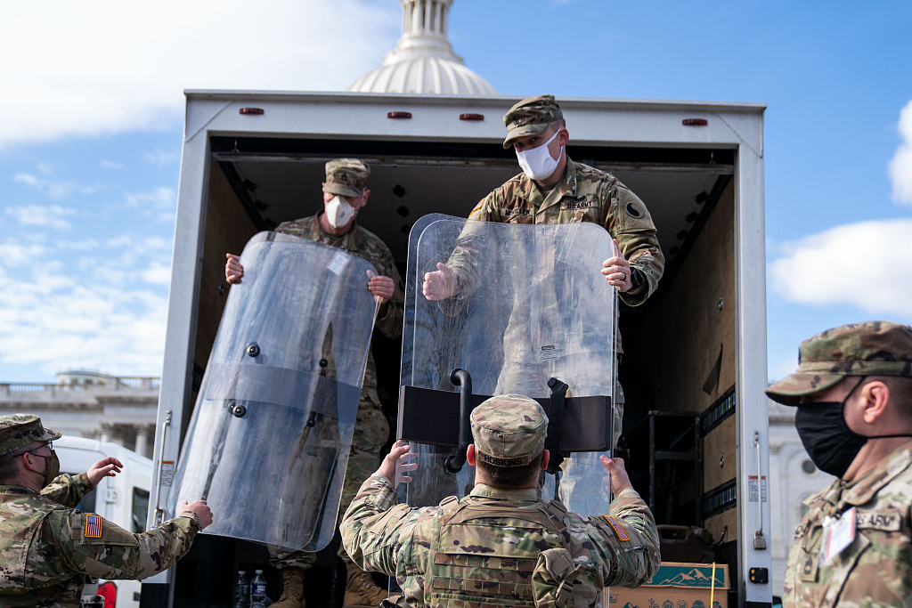 当地时间2021年1月17日,美国首都华盛顿,连日来,华盛顿特区的安保措施日趋严密,国民警卫队队员荷枪实弹巡逻。五角大楼日前宣布,已派遣2.5万名国民警卫队士兵协助总统就职典礼的安保工作。为了防止华盛顿出现集会抗议、进而引发冲突事件,白宫周围多条道路被提前封闭,周边商户普遍都钉上木板,通往总统就职典礼相关区域的每条道路路口都部署了国民警卫队军车,由国民警卫队成员站岗执勤。图片来源:人民视觉/视觉中国