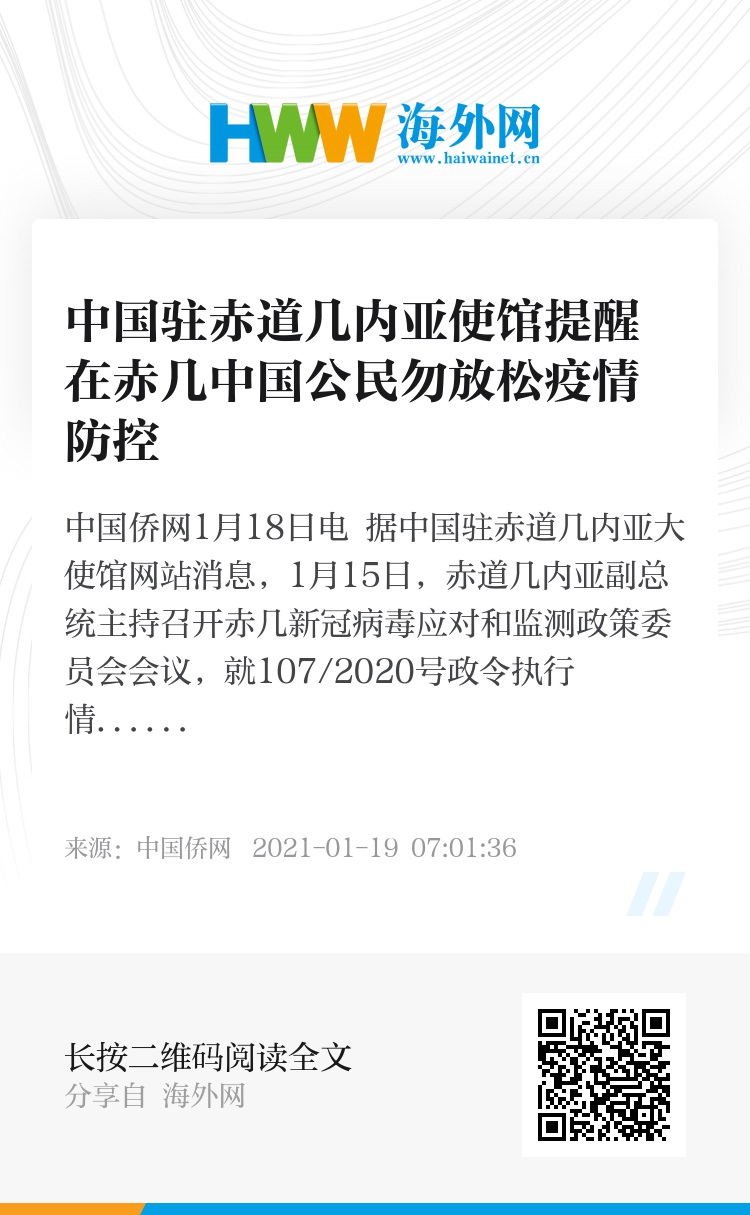 中国驻赤道几内亚使馆再次提醒在赤几中国公民,勿放松警惕,继续高度重视疫情社区传播风险,遵守赤几政府防疫规定,认真做好个人防护,避免不必要外出和社交活动。具体问题可参考《个人自我管理流程建议》和《新冠肺炎防控八问八答》。