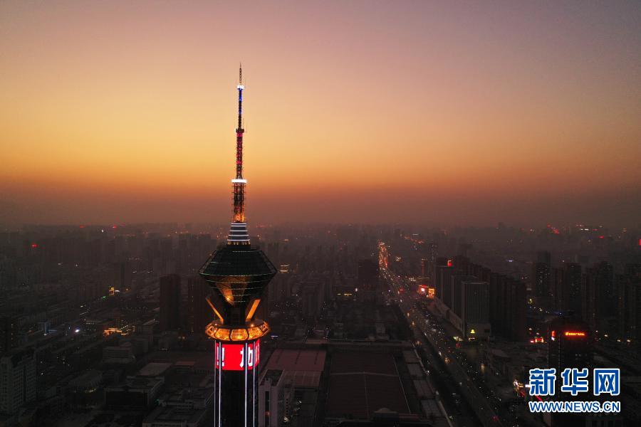 近日,河北石家庄电视塔大屏幕上打出“石家庄加油”“众志成城 防控疫情”等标语,为抗疫加油。新华社记者 邢广利 摄