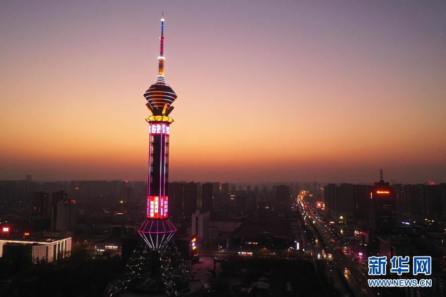 近日,河北石家庄电视塔大屏幕上打出“石家庄加油”“众志成城 防控疫情”等标语,为抗疫加油。新华社记者 邢广利 摄