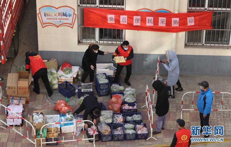 1月11日,在石家庄市桥西区汇通街道东三教社区党员便民采购站,党员志愿者们义务帮助群众分发生活物资。新华社发