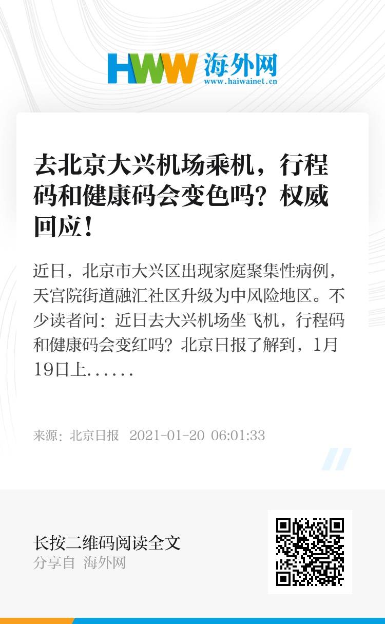 北京日报了解到,1月19日上午10时许,@北京大兴国际机场 回应网友询问:“大兴机场不是中高风险地区,在大兴机场乘机不会影响健康码和行程码的颜色。”
