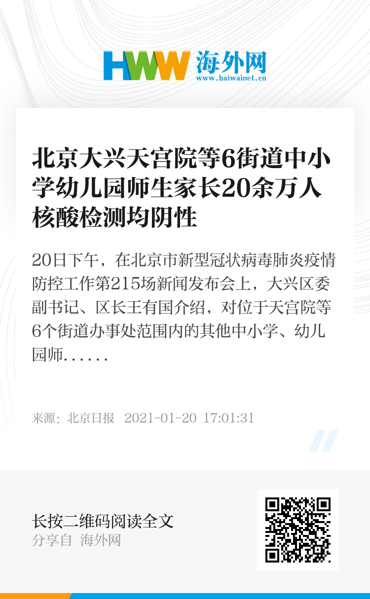 20日下午,在北京市新型冠状病毒肺炎疫情防控工作第215场新闻发布会上,大兴区委副书记、区长王有国介绍,对位于天宫院等6个街道办事处范围内的其他中小学、幼儿园师生和家长开展核酸检测,目前已出结果203090人,结果均为阴性。对教育系统往来河北省,特别是有中高风险地区往来史或接触史的师生、员工再次进行摸排,及时组织核酸检测。