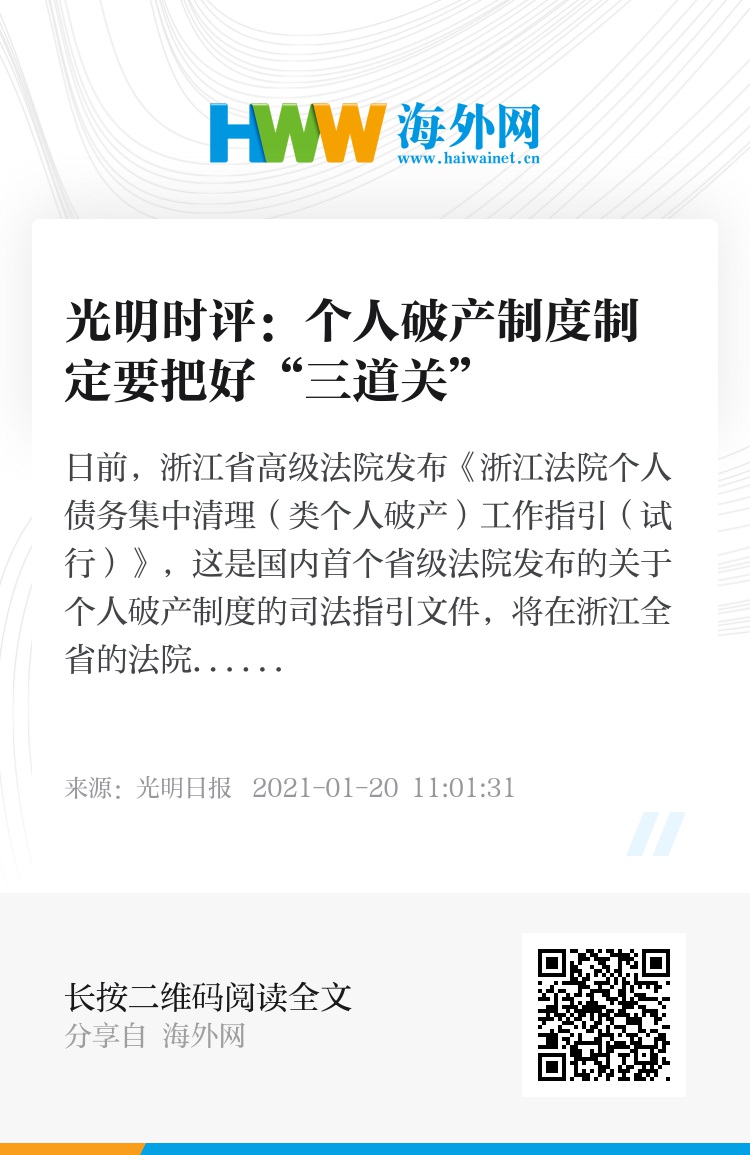 日前,浙江省高级法院发布《浙江法院个人债务集中清理(类个人破产)工作指引(试行)》,这是国内首个省级法院发布的关于个人破产制度的司法指引文件,将在浙江全省的法院系统起到重要指引作用。3月1日起,作为我国首部个人破产地方性法规,《深圳经济特区个人破产条例》也将正式实施。国内个人破产制度探索明显提速。