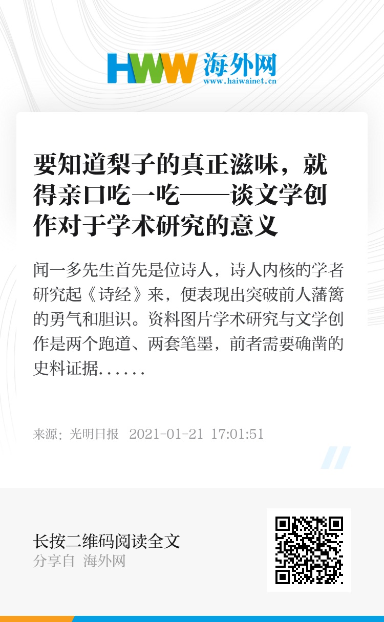 毛泽东1937年在《实践论》中说:“你要知道梨子的滋味,你就得变革梨子,亲口吃一吃。你要知道原子的组成同性质,你就得实行物理学和化学的实验,变革原子的情况。”这段话用以探讨文学创作对学术研究的意义,也自有深刻道理和启发。