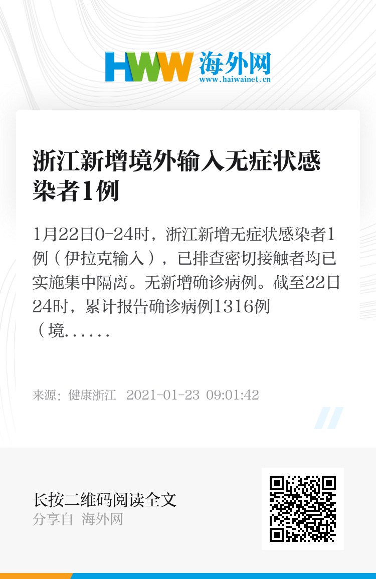 1月22日0-24时,浙江新增无症状感染者1例(伊拉克输入),已排查密切接触者均已实施集中隔离。无新增确诊病例。截至22日24时,累计报告确诊病例1316例(境外输入病例97例)。