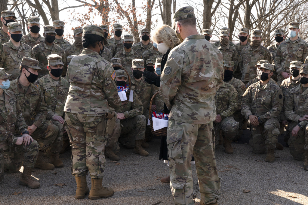 美国新总统拜登的妻子慰问国民警卫队士兵 送巧克力曲奇饼