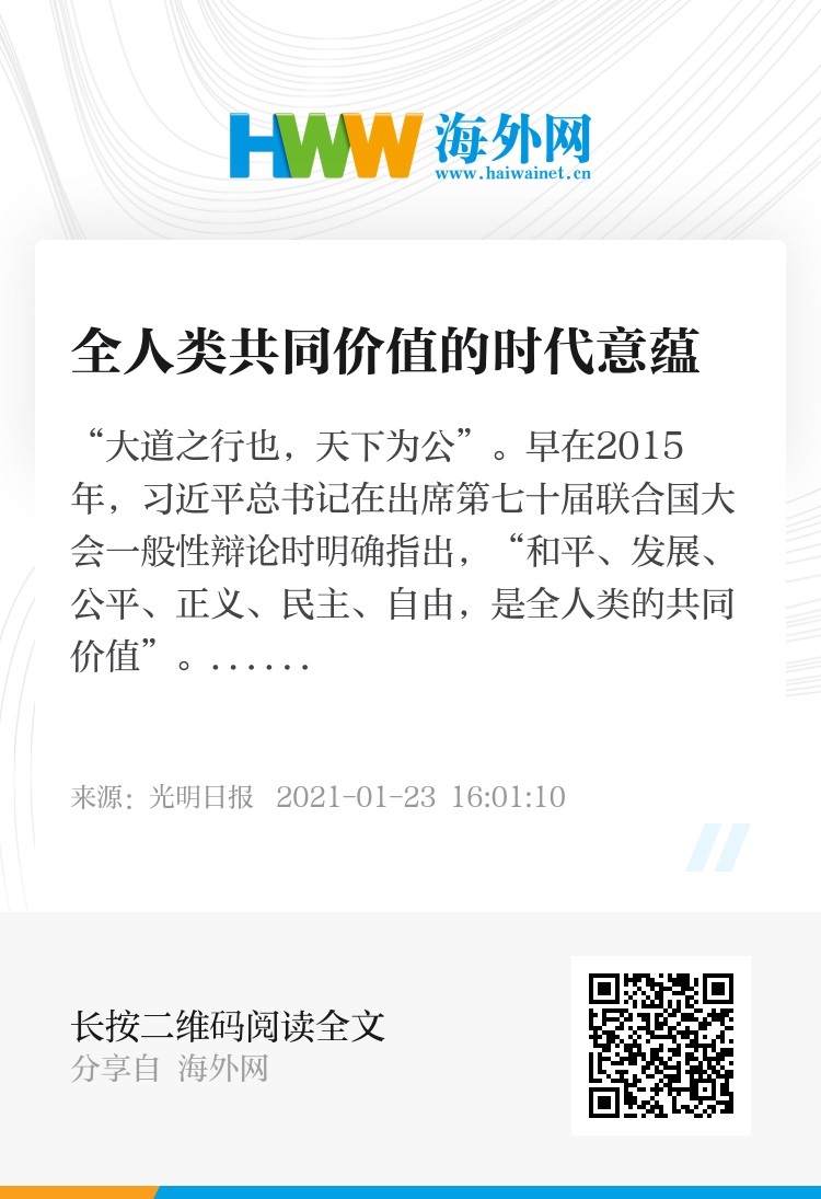 “大道之行也,天下为公”。早在2015年,习近平总书记在出席第七十届联合国大会一般性辩论时明确指出,“和平、发展、公平、正义、民主、自由,是全人类的共同价值”。此后,习近平总书记在多个场合多次提及全人类共同价值的内涵和外延。2020年,在纪念中国人民志愿军抗美援朝出国作战70周年大会上的讲话中,习近平总书记再次强调:“作为负责任大国,中国坚守和平、发展、公平、正义、民主、自由的全人类共同价值,坚持共商共建共享的全球治理观,坚定不移走和平发展、开放发展、合作发展、共同发展道路。”这一重要论述启示我们,全人类共同价值为全球治理提供了观念基础,为人类社会健康发展提供了价值支撑。