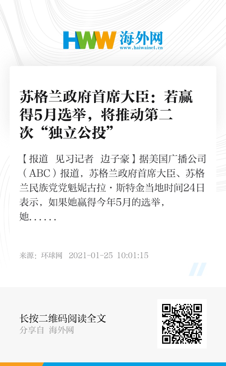 报道还称,苏格兰民族党表示如果在5月赢得苏格兰议会的多数席位,将通过法案允许在新冠疫情结束后进行第二次公投。届时如果约翰逊政府反对,将会付诸法庭。