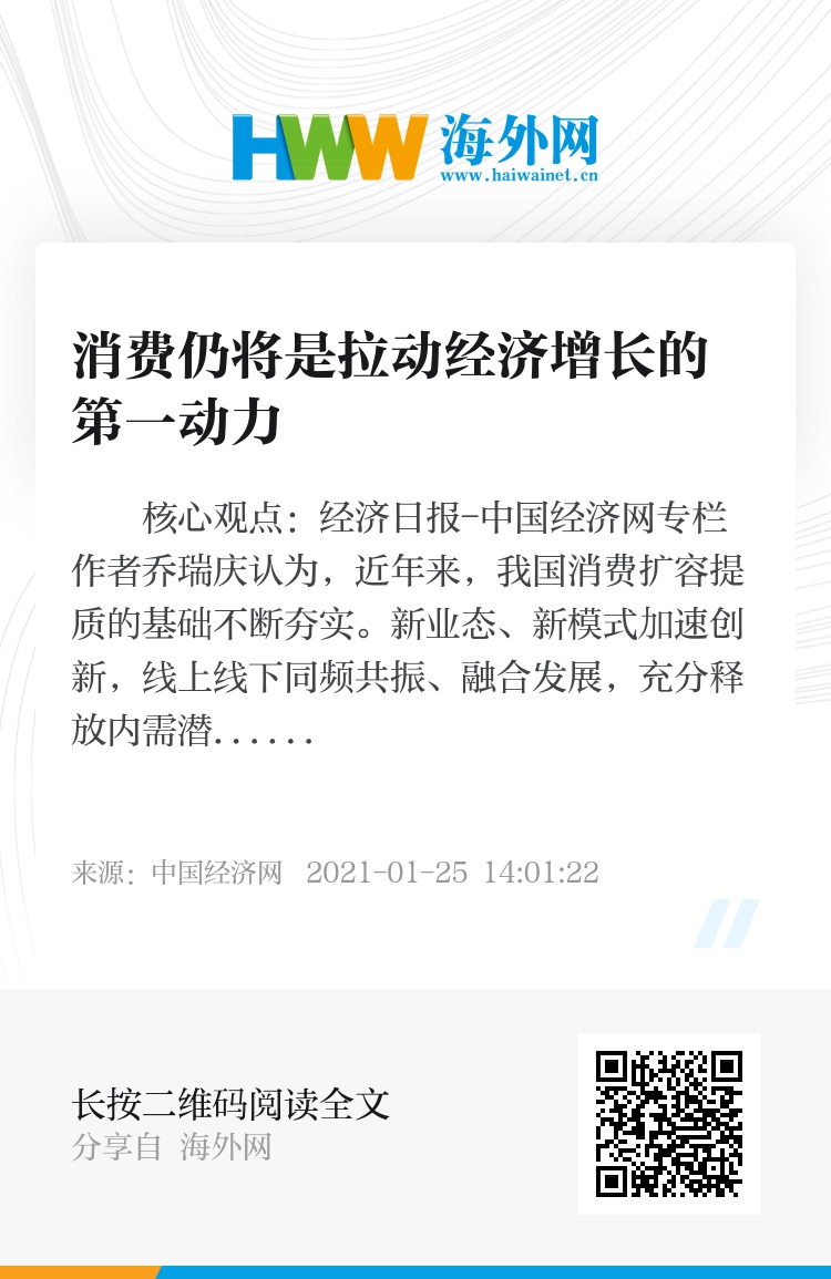 中国作为一个大国经济体,经济增长内生动力必然主要源于消费。这是大国经济发展的规律。近年来,我国消费扩容提质的基础不断夯实。新业态、新模式加速创新,线上线下同频共振、融合发展,充分释放内需潜力,必将推动我国经济逐步形成以国内大循环为主体、国内国际双循环相互促进的新发展格局。(经济日报-中国经济网专栏作者 乔瑞庆)