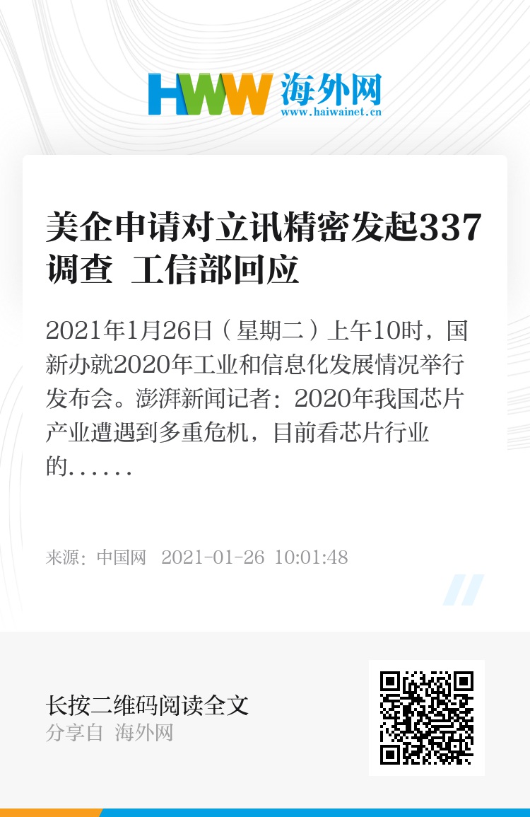 至于你刚才提到的立讯精密,也对此作个简要回应。近日,美国企业向美国国际贸易委员会提出对我国立讯精密等企业发起337调查申请,指控相关企业在美出口、进口或销售的特定电气连接器和保持架及组件和下游产品侵犯其专利,工信部对此高度关注。应该说,我国电子信息产业发展既有赖于本土企业的壮大、崛起,也离不开有效的国际合作。作为产业主管部门,我们积极支持电子元器件和精密加工企业高质量发展,我们坚决保护知识产权,同时也反对滥用权利,打压正常商业竞争的霸凌行为。针对上述337调查申请,相关企业已发布公告,并开展积极的应对。下一步,工信部将会同有关部门指导相关企业加强应对,维护好企业的合法权益。谢谢。