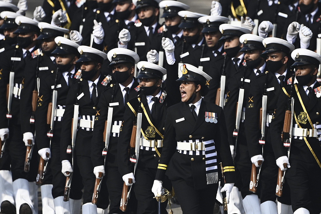 当地时间2021年1月26日,印度首都新德里,当地举行阅兵仪式庆祝第72个共和国日,印度总理莫迪出席节日典礼。印度总统科温德、总理莫迪检阅了各兵种部队,印度空军展示了最新装备的“阵风”战斗机。印度政府各部门还制作了花车,包括防疫主题的花车提醒民众加强防疫意识。受新冠疫情影响,今年阅兵式游行路线长度和允许参与人数都大幅缩减。图片作者:人民视觉
