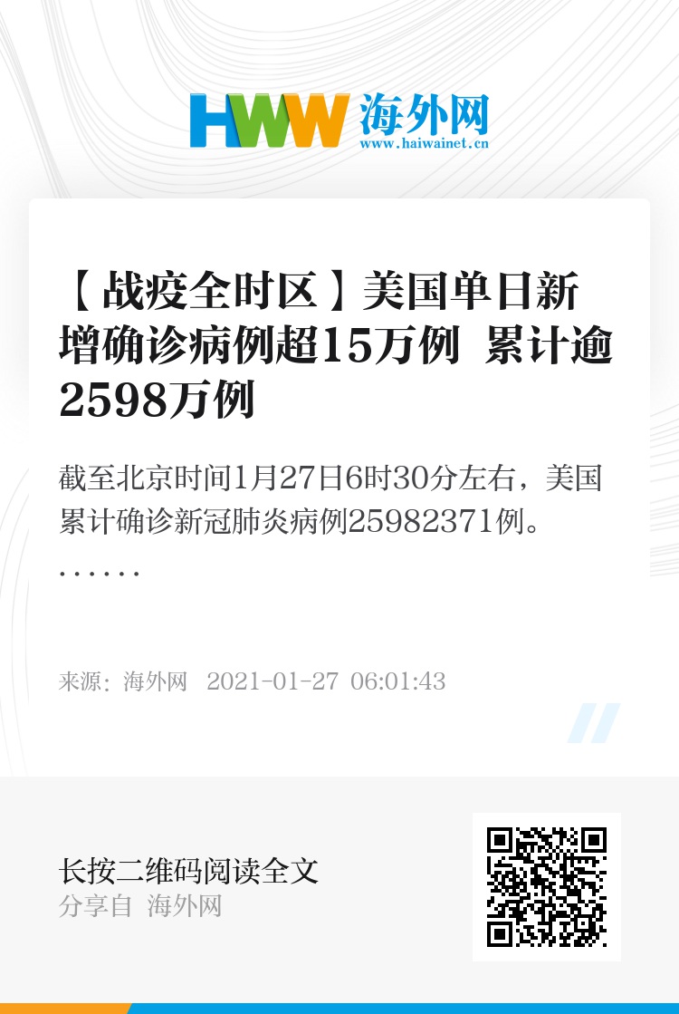 海外网1月27日电 根据Worldometer实时统计数据,截至北京时间1月27日6时30分左右,美国累计确诊新冠肺炎病例25982371例,累计死亡病例434586例。与前一日6时30分数据相比,美国新增确诊病例158322例,新增死亡病例3586例。(海外网 李萌)