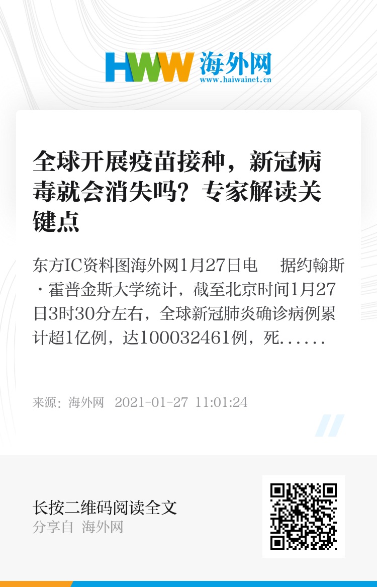 海外网1月27日电 据约翰斯·霍普金斯大学统计,截至北京时间1月27日3时30分左右,全球新冠肺炎确诊病例累计超1亿例,达100032461例,死亡病例2149818例。随着变异新冠病毒在多国出现,当前全球疫情形势依旧严峻。各国在加紧抗疫的同时,也在加快大规模的新冠疫苗接种。现在都有哪些新冠疫苗上市?它们的有效性和接种情况如何?新冠病毒是否会随着全面接种疫苗而消失?本文为你一一解答。