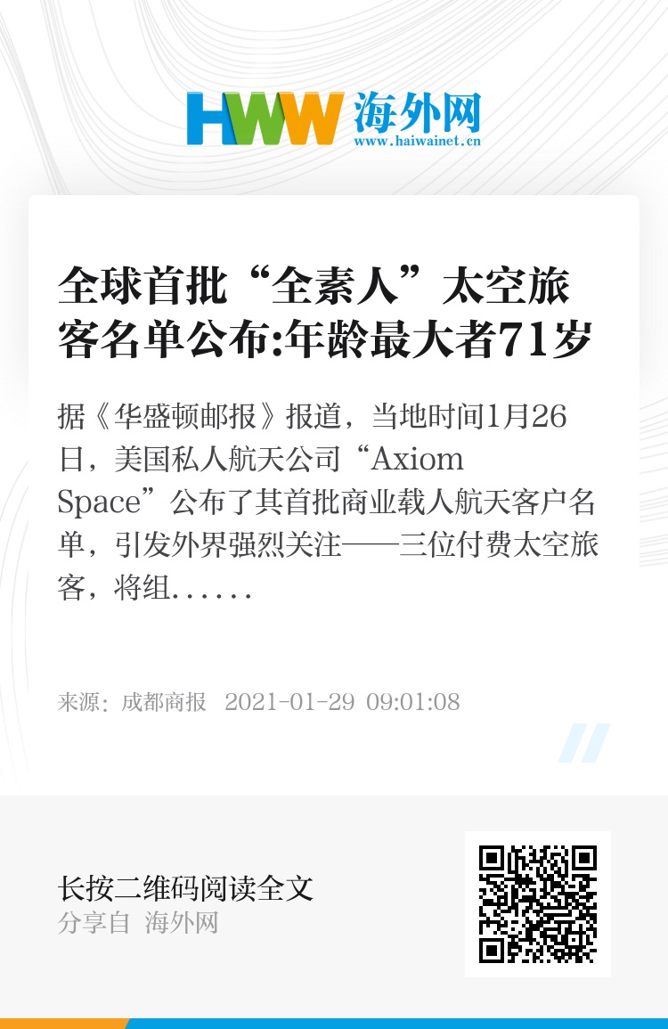据《华盛顿邮报》报道,当地时间1月26日,美国私人航天公司“Axiom Space”公布了其首批商业载人航天客户名单,引发外界强烈关注——三位付费太空旅客,将组成全球首支“全素人”——全部由非航天员组成——的宇航队伍。