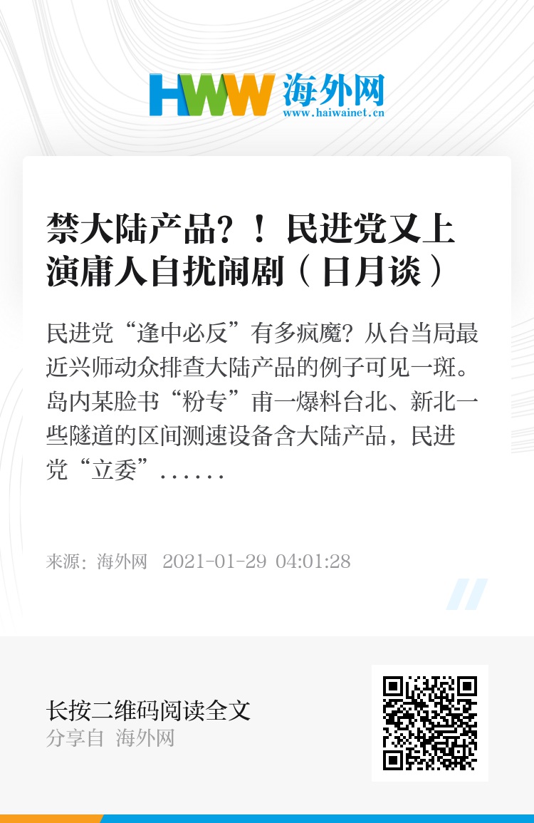 显然,民进党对大陆产品有严重的过敏症,对操作“反中”“恐中”有严重的依赖症。此前,民进党当局还曾配合美国贸易战禁止岛内制造商进口大陆原材料,宣布禁用华为,凡电子产品标识“中国台湾”就禁卖,要求各级公务机关替换掉大陆品牌的通讯产品,禁止公务使用的手机及计算器下载和连接大陆社交网站及搜索引擎……凡此种种,其借口无非是“台湾安全”,就连大陆的“双11”购物节在台受追捧,在民进党“立委”眼中也是“安全问题”。