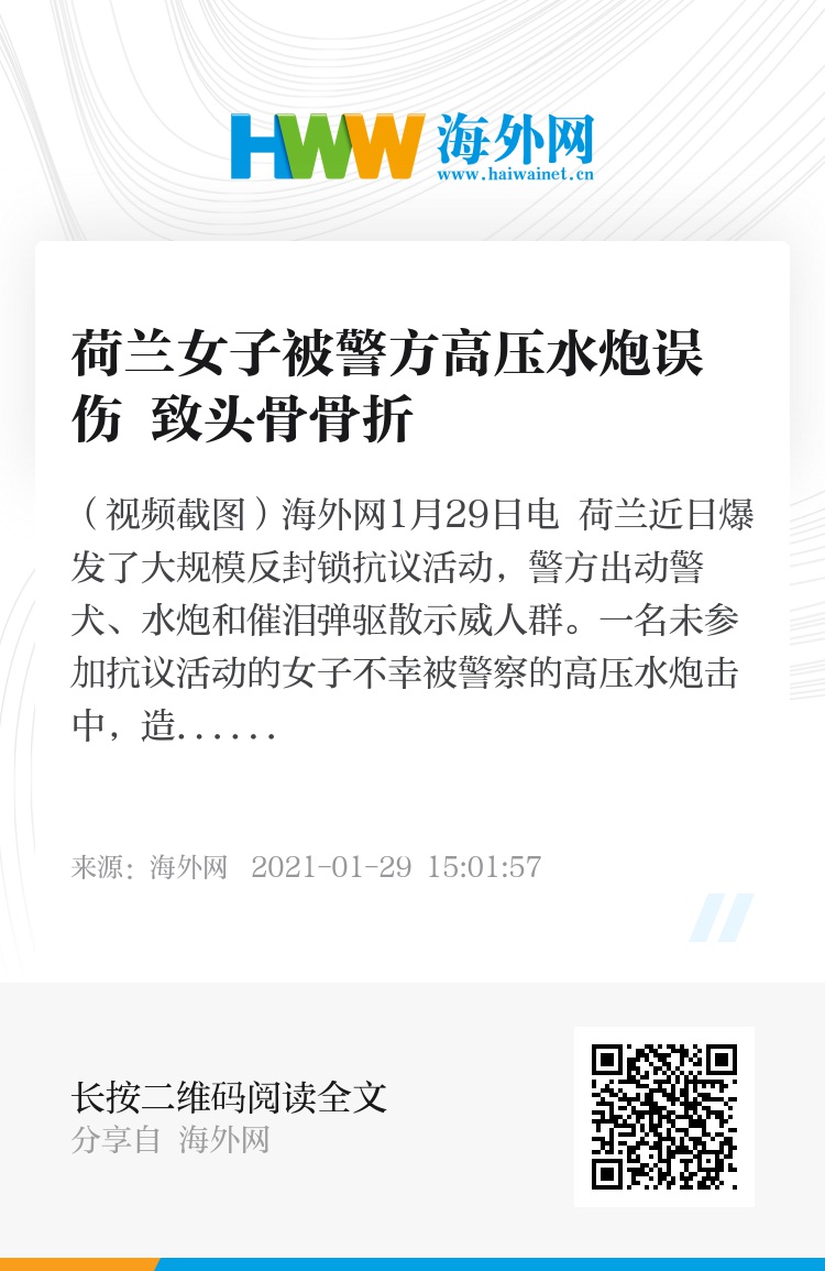 海外网1月29日电 荷兰近日爆发了大规模反封锁抗议活动,警方出动警犬、水炮和催泪弹驱散示威人群。一名未参加抗议活动的女子不幸被警察的高压水炮击中,造成头部受伤。